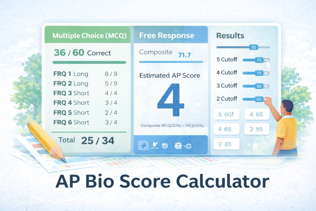 Want to know where you stand before exam day? This AP Bio score calculator estimates your predicted AP Biology score (1–5) using your multiple-choice results and free-response points. It’s designed for practice tests so you can quickly measure progress and adjust your study plan.