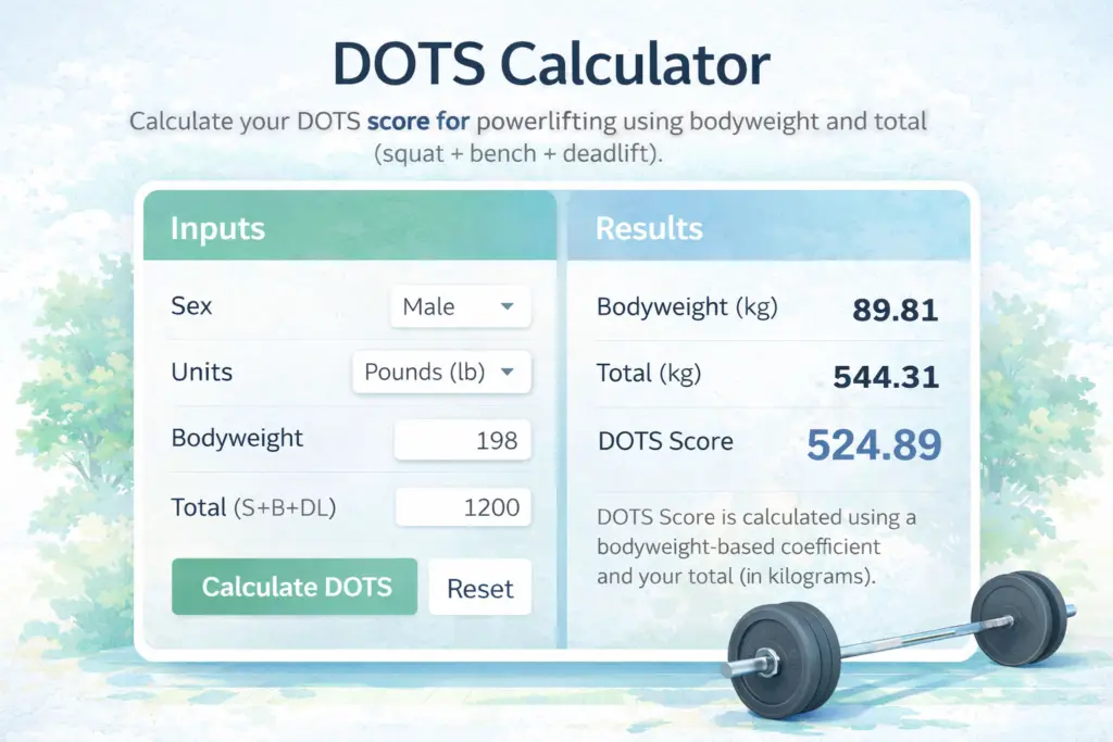 DOTS uses a coefficient based on bodyweight. This tool converts lb → kg automatically when needed.
